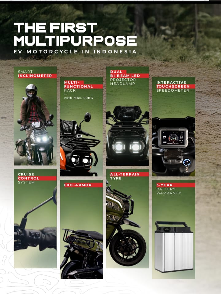 Motor ini menjadi salah satu inovasi terbaru di pasar kendaraan listrik Indonesia, dengan mengusung konsep multipurpose electric motorcycle yang dirancang untuk berbagai medan -mulai dari jalan perkotaan hingga semi off-road.